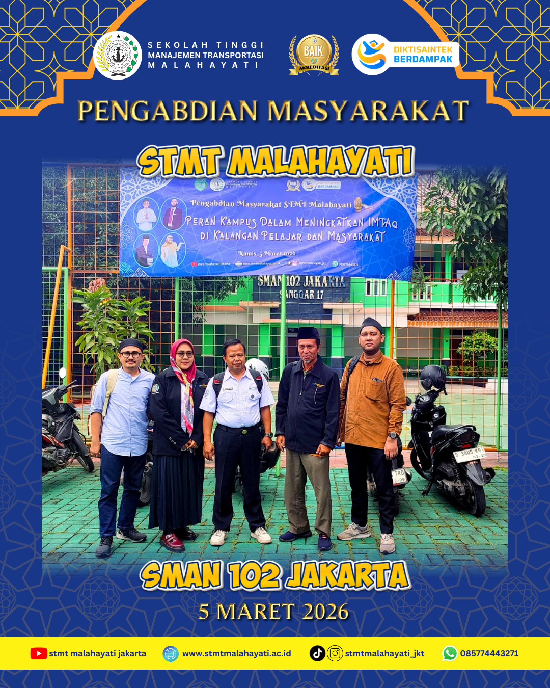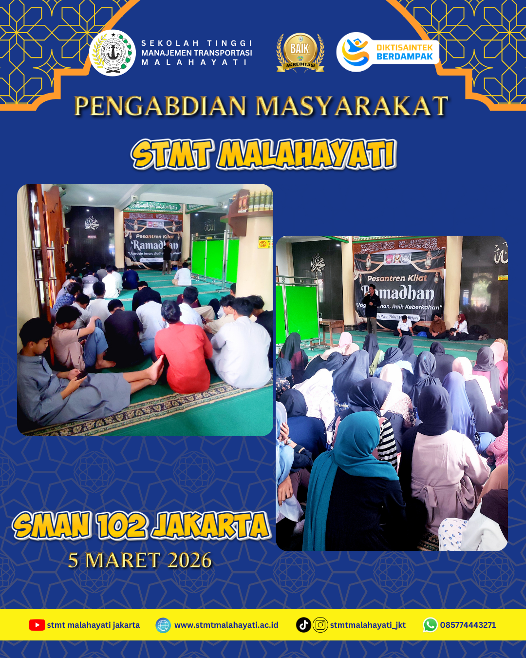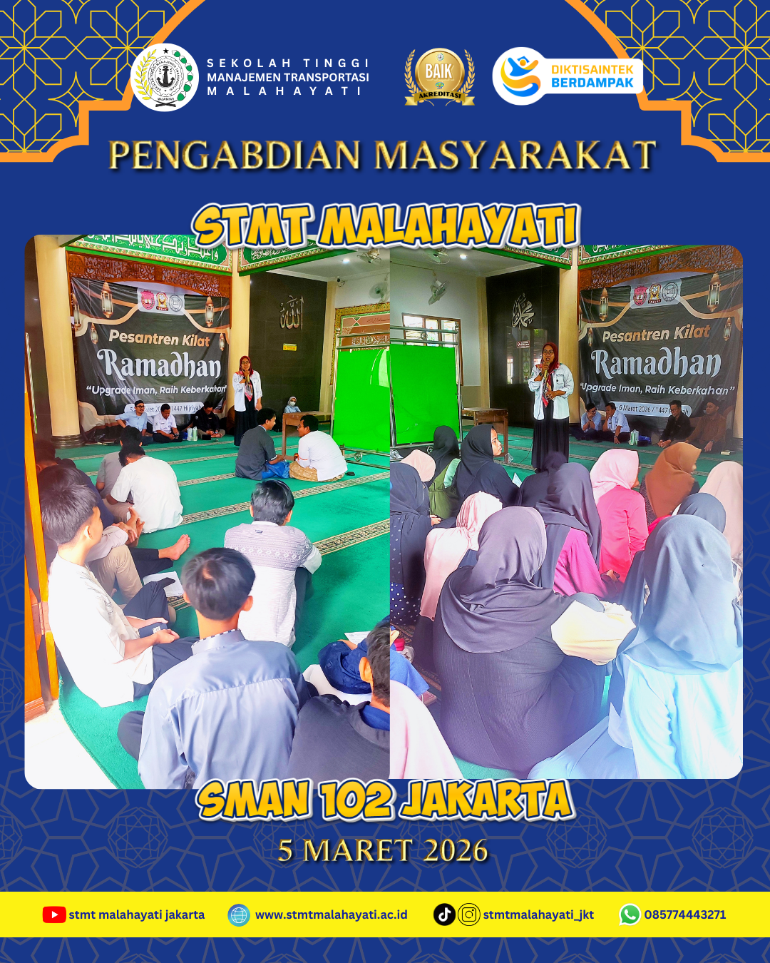 JAKARTA – Sebagai wujud nyata dari Tri Dharma Perguruan Tinggi, Sekolah Tinggi Manajemen Transportasi (STMT) Malahayati melaksanakan kegiatan Pengabdian Masyarakat di SMAN 102 Jakarta pada tanggal 5 Maret 2026. Kegiatan ini bertepatan dengan momentum Pesantren Kilat yang diselenggarakan oleh pihak sekolah untuk memperdalam spiritualitas dan karakter para siswa.