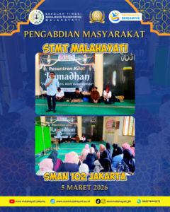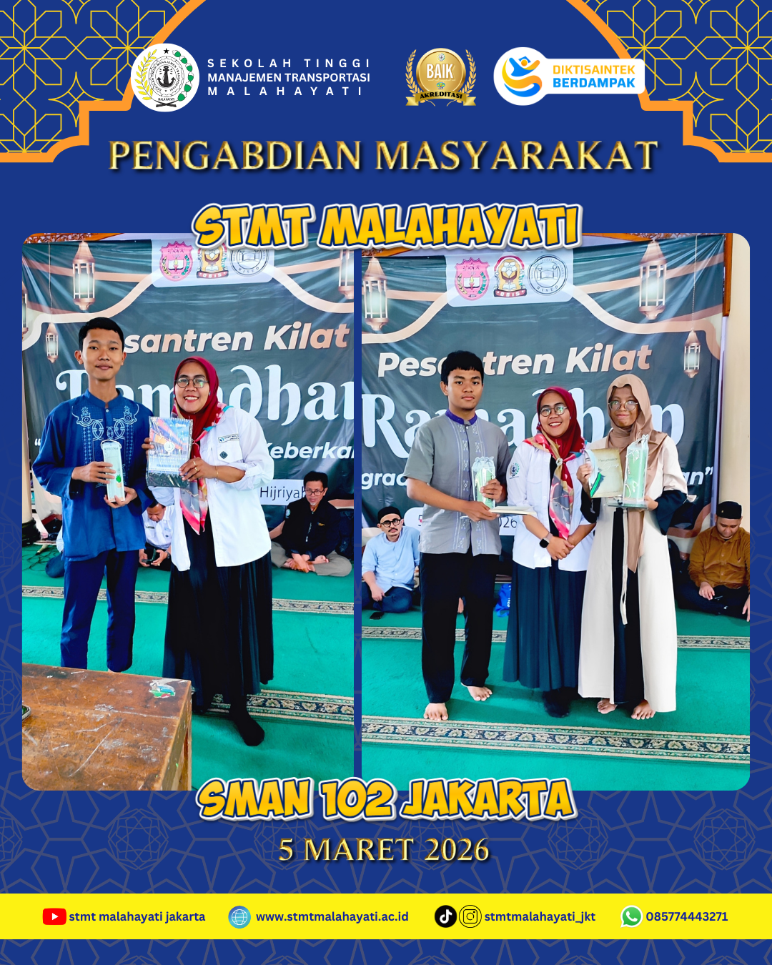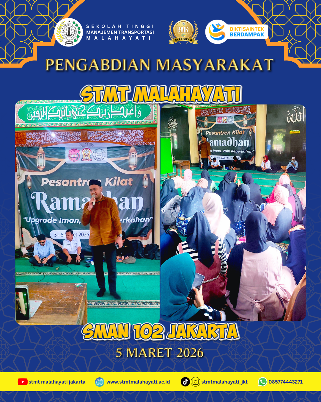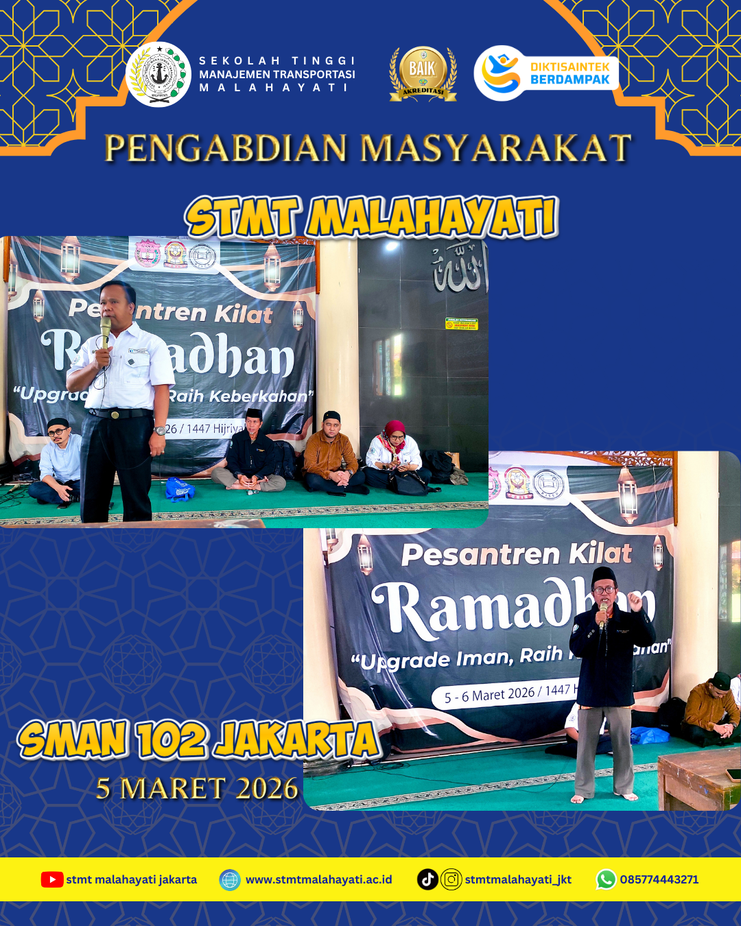 JAKARTA – Sebagai wujud nyata dari Tri Dharma Perguruan Tinggi, Sekolah Tinggi Manajemen Transportasi (STMT) Malahayati melaksanakan kegiatan Pengabdian Masyarakat di SMAN 102 Jakarta pada tanggal 5 Maret 2026. Kegiatan ini bertepatan dengan momentum Pesantren Kilat yang diselenggarakan oleh pihak sekolah untuk memperdalam spiritualitas dan karakter para siswa.