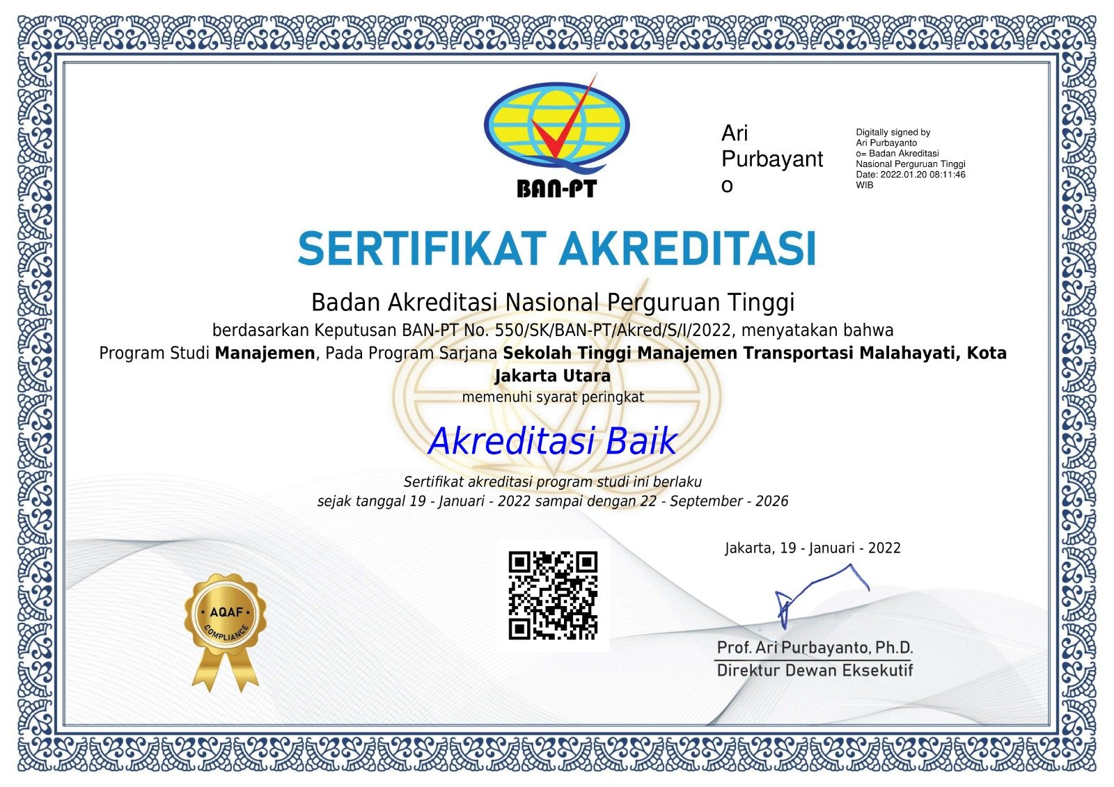 Berdasarkan Surat Keputusan Akreditasi yang dikeluarkan oleh BAN-PT, Program Studi Manajemen di STMT Malahayati terakreditasi BAIK sejak tanggal 19 Januari 2022 yang berlaku hingga 22 September 2026.